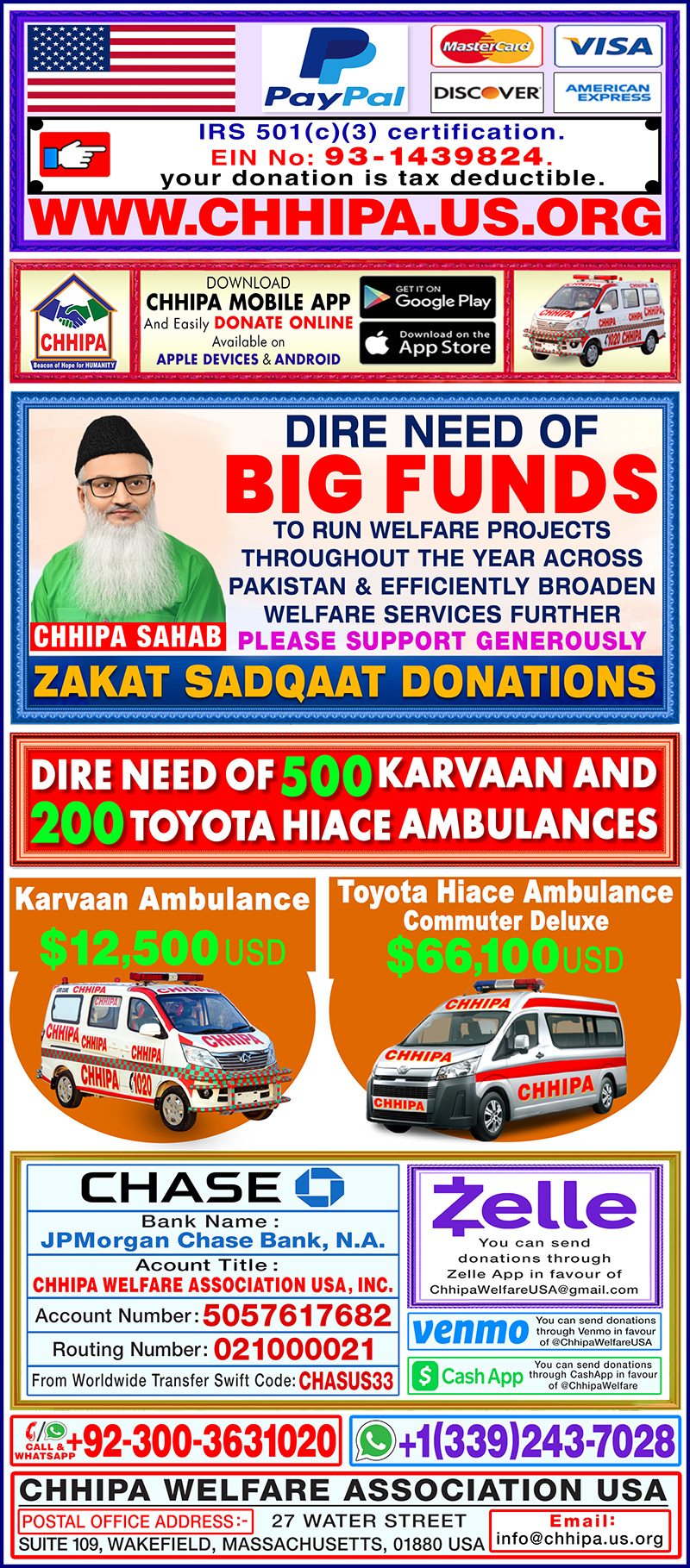 You can send donations through Zelle App in favour of ChhipaWelfareUSA@gmail.com