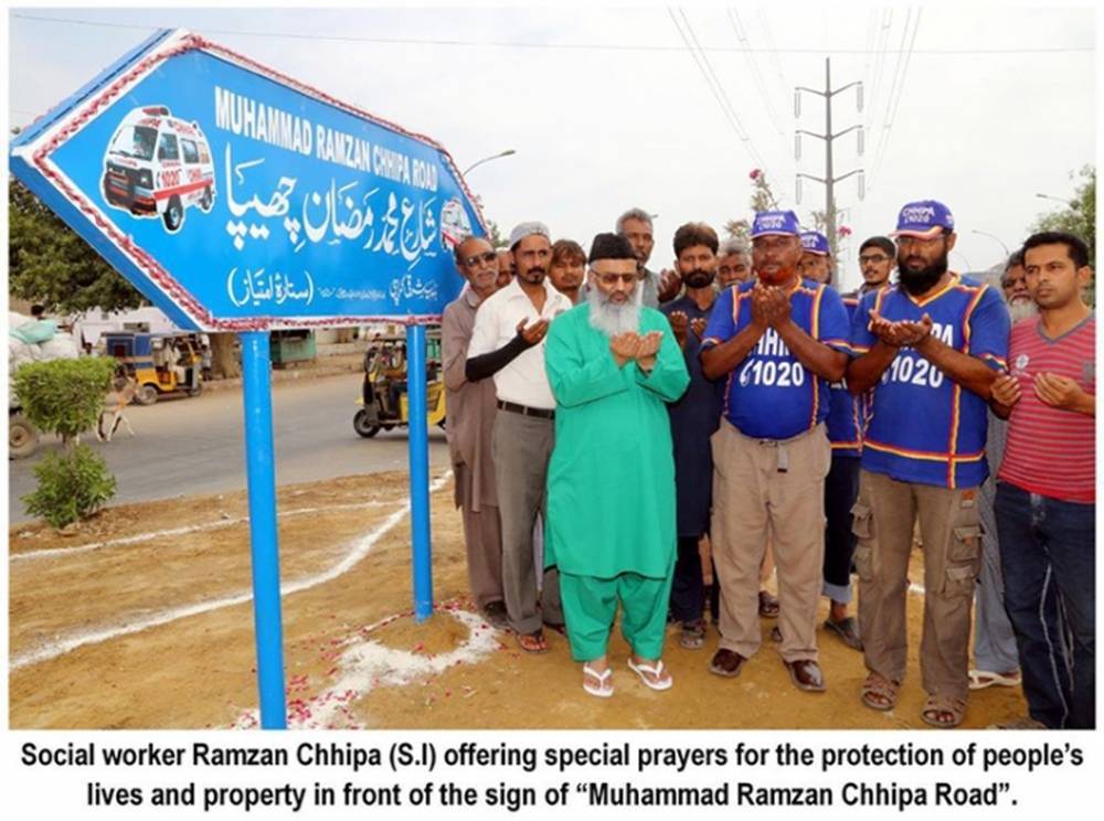 16th September, 2013, Karachi Metropolitan Corporation (KMC) dedicated to Social Worker Muhammad Ramzan Chhipa (Sitara-e Imtiaz) one of the busiest avenues of Karachi, the 4000 TO 16000 ROAD AS MUHAMMAD RAMZAN CHHIPA ROAD IN KORANGI to Social Worker Muhammad Ramzan Chhipa.